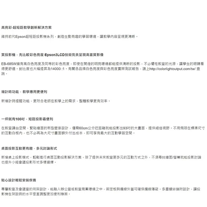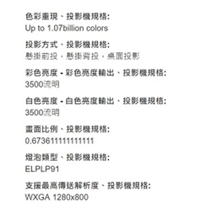 WXGA/白色亮度=彩色亮度3500lm,投影教學不失真