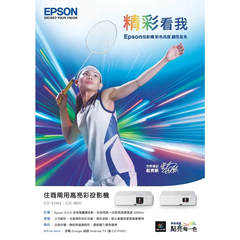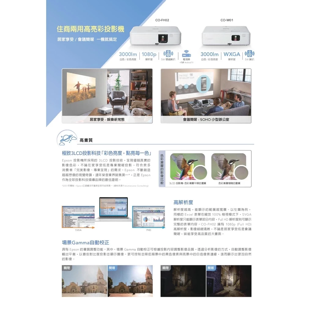 一般人挑選投影機都會注意流明度,也就是根據於全白區塊所測量的亮度,卻忽略了彩色亮度也是相當重要。全新Epson CO-FH02住商兩用投影機,採用3LCD投影技術,「白色亮度」及「彩色亮度」都達到3,000流明,投影免觀燈,不論從哪個角度觀賞,影像皆艷麗清晰。