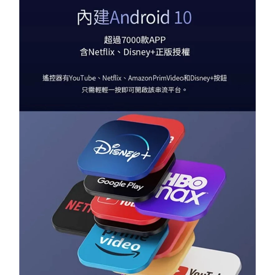 豐富的媒體選擇:Android TV 10.0 支援您在 7,000 多個應用程式上觀看 400,000 多部電影和劇集,無線串流娛樂從不間斷。
