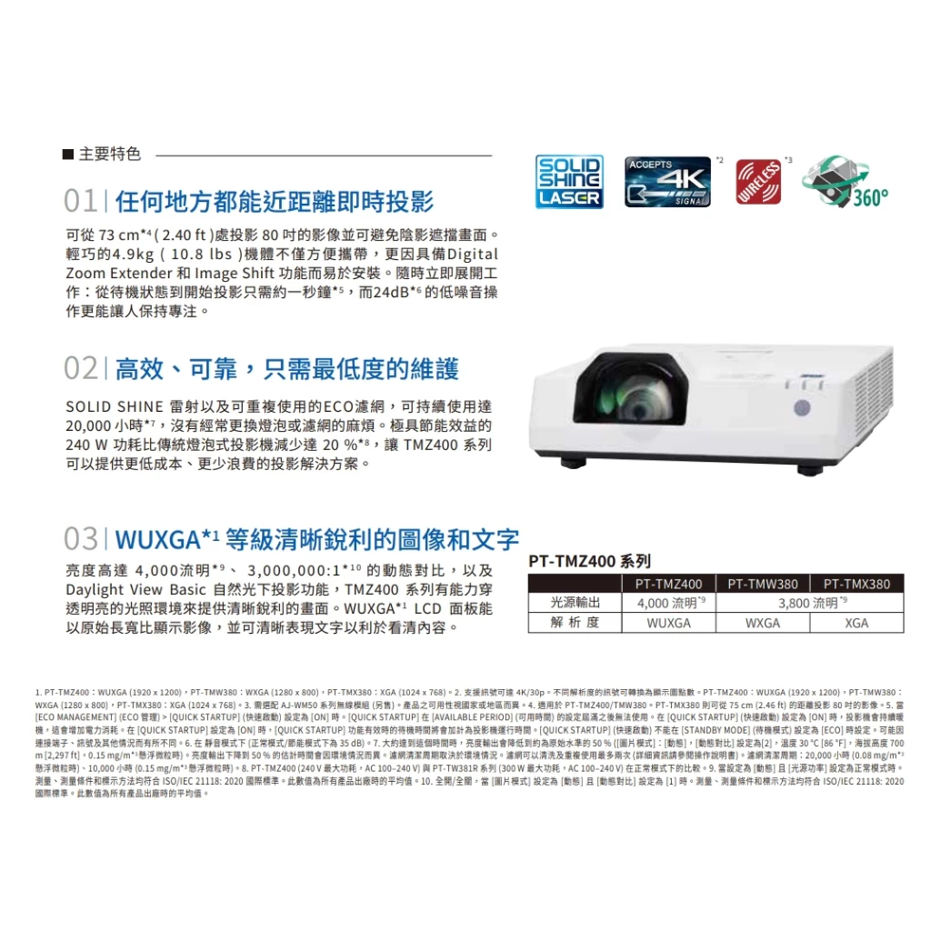 Panasonic PT-TMZ400T 雷射短焦投影機 (4000流明) WUXGA