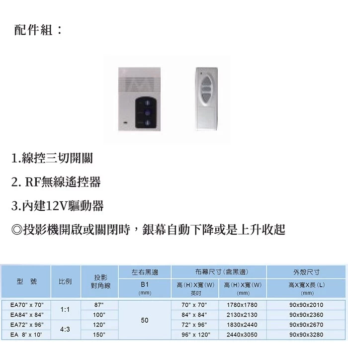 3.內建12V驅動器 ◎投影機開啟或關閉時,銀幕自動下降或是上升收起